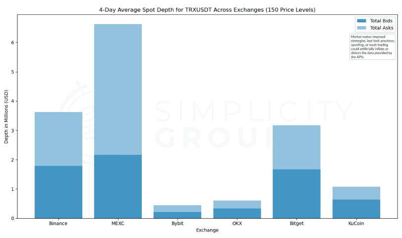 MEXC still stands as the exchange with largest depth, although it’s still leading, depth conditions showed less liquidity concentrated near the mid price from $6M with 150 price levels to $3.8M at 1% from the mid price. Interestingly, Bitget surpassed Binance in depth at 1% from TRX’s current price, as Binance falls behind having lower depth at this level when compared to 150 price levels, falling from $3.5M to $2M while Bitget shows more consistency.
