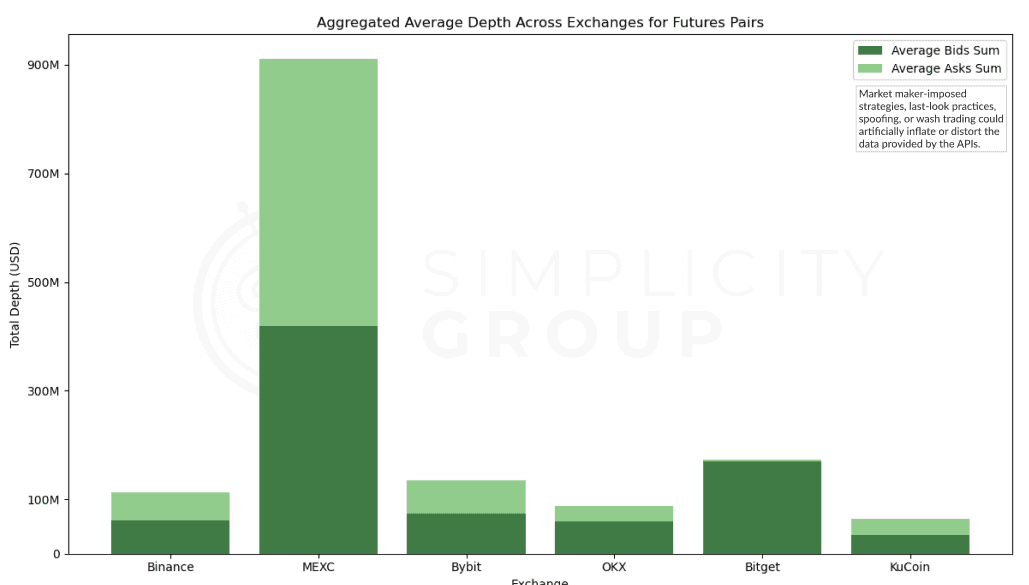 While MEXC stands out considerably with its high depth across futures pairs, this does not necessarily indicate a true representation of overall market demand. When only one exchange shows such pronounced market depth, while others are more closely aligned, it may suggest that MEXC’s liquidity conditions are specific to its platform rather than reflective of broader market sentiment.