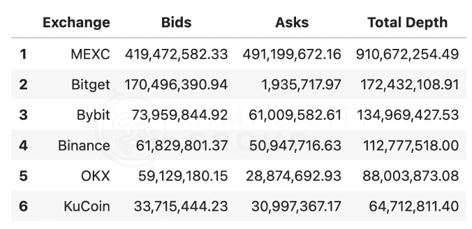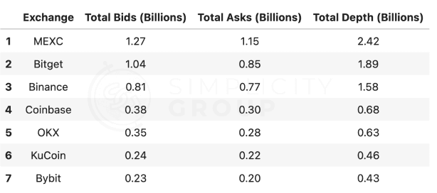 The table below shows that MEXC leads with $2.42Bn in depth near the asset’s mid-price, followed by Bitget and Binance. KuCoin and ByBit are the least liquid exchanges in this range, each with less than $500Mn near mid-price.