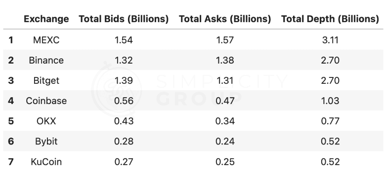 Bitget leads significantly with a depth exceeding $3Mn, with a portion of the depth being bids. This bid-heavy composition suggests stronger buying interest or liquidity availability on the buy side. MEXC and Binance stand as the exchanges following Bitget, each displaying depths around the $2.5Mn mark.