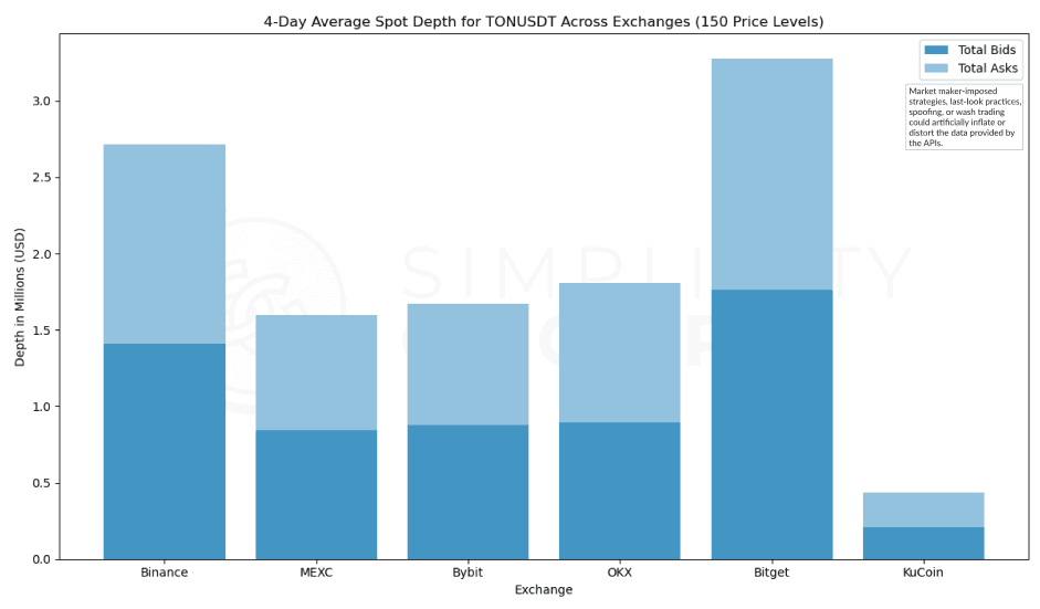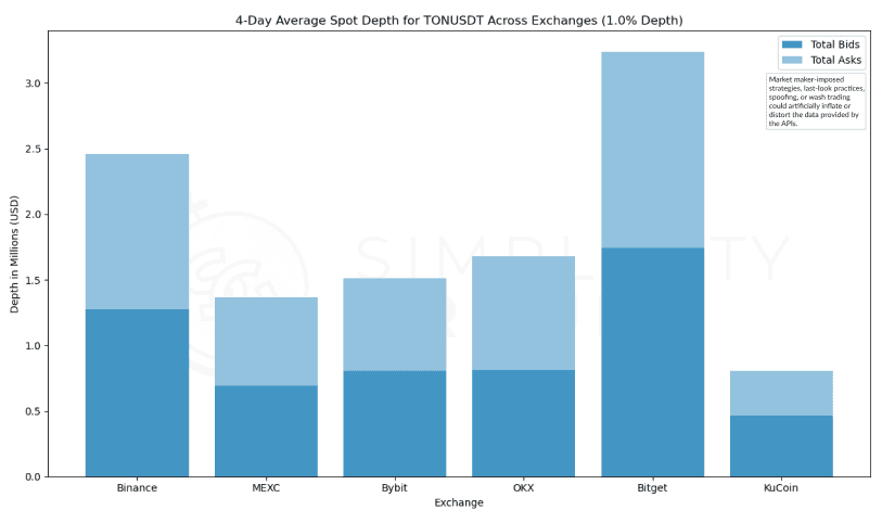 Bitget and Binance stand out in terms of depth, with Bitget showing a stronger trend toward buying interest. MEXC, ByBit, and OKX show comparable levels of depth, each around the $1.5Mn mark while KuCoin ranks last with a minimal total depth in comparison, sub-$0.5Mn. Note that Coinbase is missing in this chart because TON is not listed on the exchange.