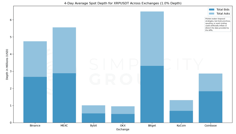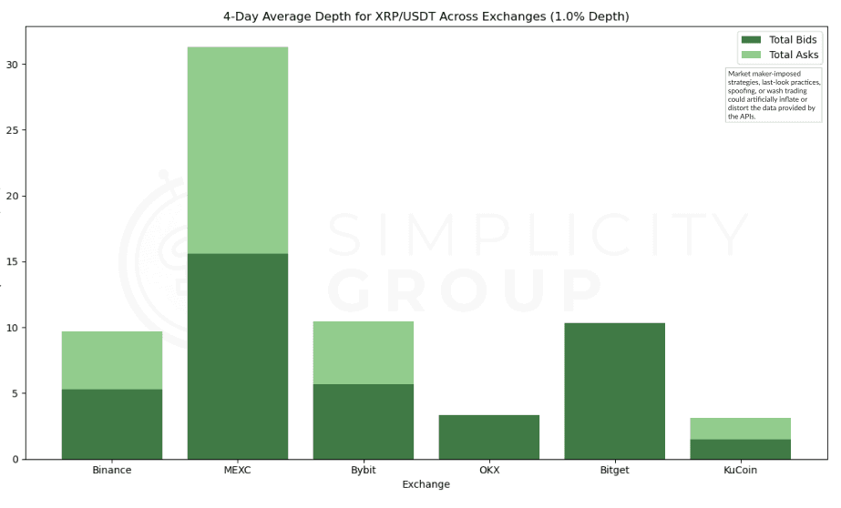 Just as with the depth using 150 price levels, Bitget leads in market depth for the XRP/USDT pair, with MEXC and Binance closely behind Bitget’s depth for this pair. Coinbase ranked third while, on the other hand, ByBit, OKX, and KuCoin, fall significantly behind the top exchanges, showing considerably lower depth for XRP/USDT.