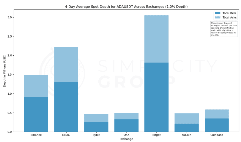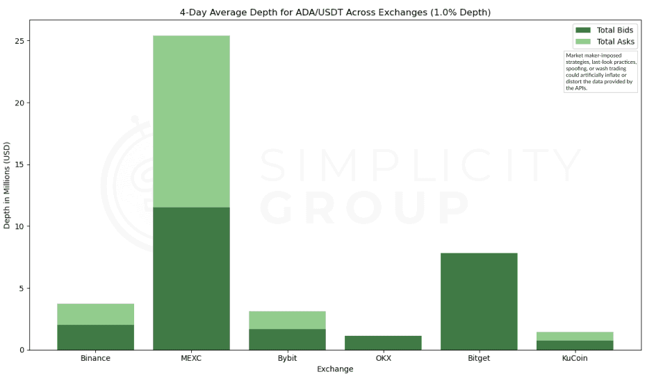 MEXC leads with $25Mn in depth, showing a greater skew towards asks. Notably, Bitget’s depth is entirely represented by bids, indicating a strong buying presence without matching sell interest, which may suggest heightened demand on this exchange and potential struggles to fulfil buy orders. However, given Cardano’s lack of momentum since the last bull run, this is peculiar.