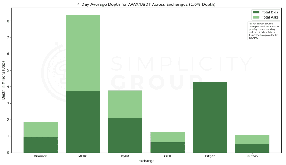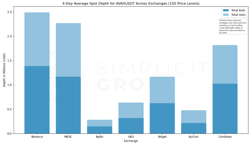 Binance leads in total depth for AVAX/USDT, nearing $2.5Mn while MEXC follows closely behind. Both exchanges exhibit a balanced distribution between bids and asks, indicating robust depth, which is favourable for trading experience. Coinbase also shows considerable depth, whilst ByBit and KuCoin show the lowest depths among the exchanges, with ByBit presenting minimal liquidity.