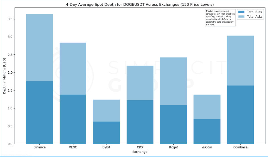 Binance shows the highest total depth for the DOGE/USDT pair, exceeding $3.5Mn. This depth is well-balanced between bids and asks, indicating strong liquidity on both sides of the order book. MEXC and Coinbase rank next in depth, with Coinbase slightly behind Binance and showing a balanced bid-ask distribution. Coinbase, although also having significant depth, has a slightly higher proportion of asks, suggesting potential selling pressure. ByBit and KuCoin display the lowest total depths among the exchanges, both with values below $1.5Mn.