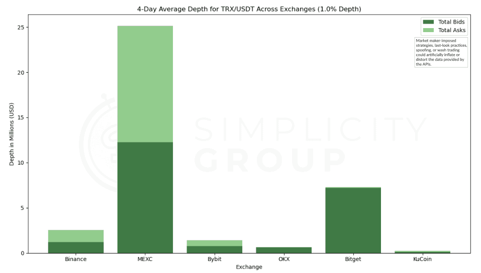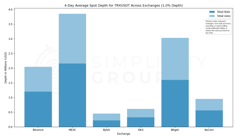 MEXC leads significantly with a total depth exceeding $6Mn, primarily made up of asks. This dominance suggests strong selling interest or higher liquidity availability on the sell side for the TRX/USDT pair. Binance follows as the second-highest in depth, showing a balanced bid-ask distribution around the $3.6Mn mark. Bitget ranks third with a depth of around $3Mn, while ByBit, OKX, and KuCoin display significantly lower depths, each at or below $1Mn.