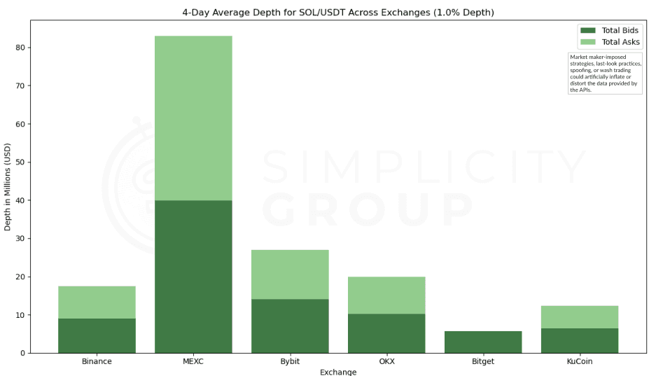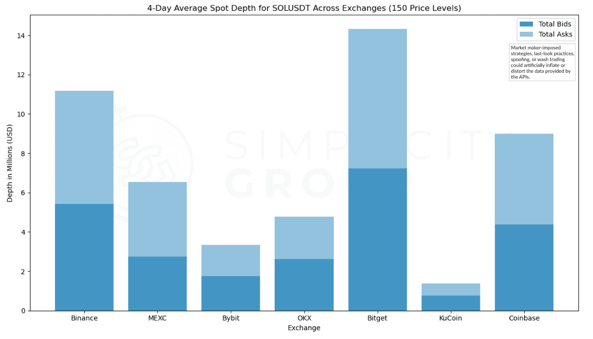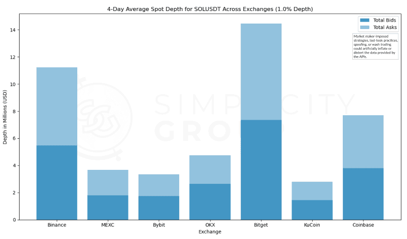 Bitget holds the greatest depth for the SOL/USDT pair using orders 1% within the mid price, averaging over $14Mn in depth with a good bid-ask balance. Binance follows not too far behind with $11Mn in depth and Coinbase ranks third. All other exchanges, MEXC, Bitget, OKX, and KuCoin show similar, but lower levels of depth than the top 3.