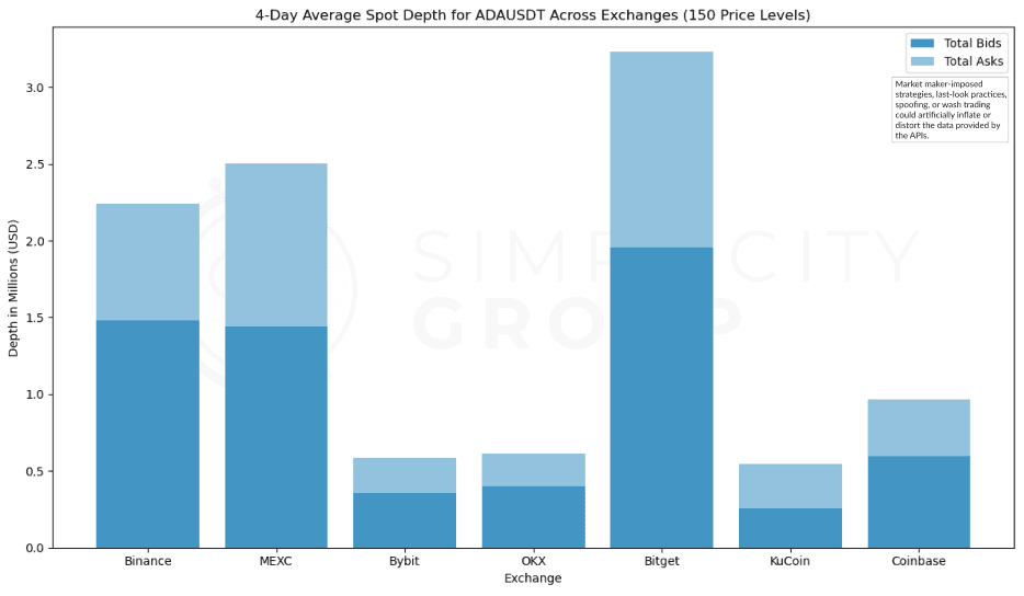 Thus, MEXC’s leading position highlights unique liquidity provisioning methods, and the more modest depths on other exchanges potentially reflect the actual market dynamics. The same can be said to a lesser extent for Bitget, and for the times when certain exchanges (e.g. OKX for ADA) only showed bids with practically no asks.