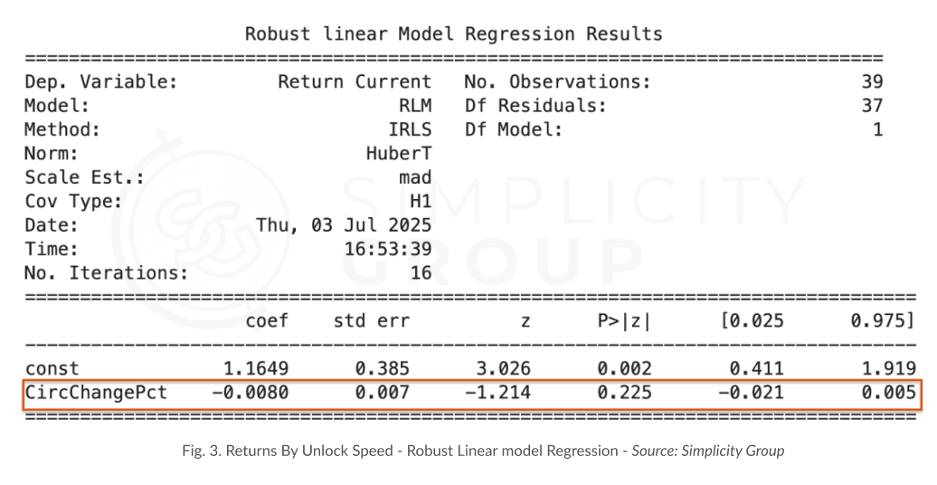 In this section, we analyse whether the change in circulating supply, calculated from the initial token unlocks to the present circulating supply, has any influence on price returns.