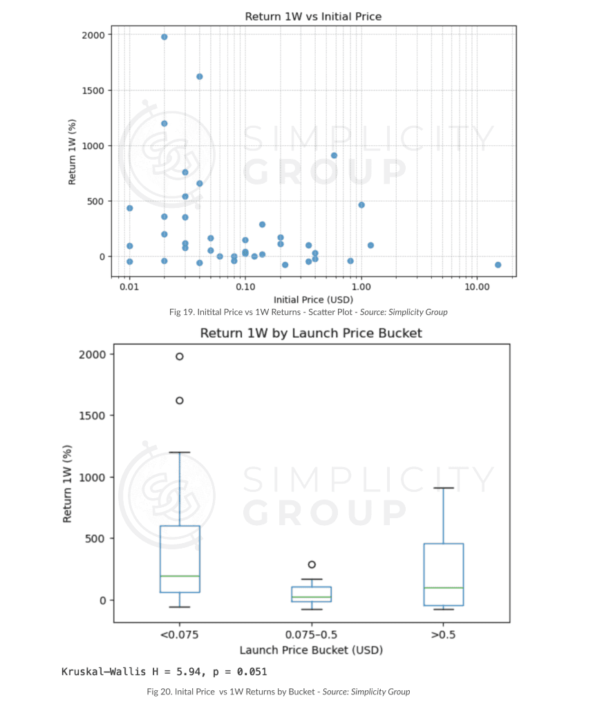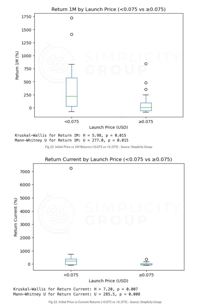 In simpler terms, the Kruskal Wallis and Mann-Whitney tests both confirmed that tokens launched at lower prices (<$0.075) consistently outperformed more expensive ones, in both short and long term post-TGE. The results were also not random, but solidified by clear statistical significance by high H and U values for the Kruskal-Wallis and Mann-Whitney tests, respectively.