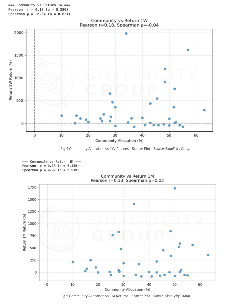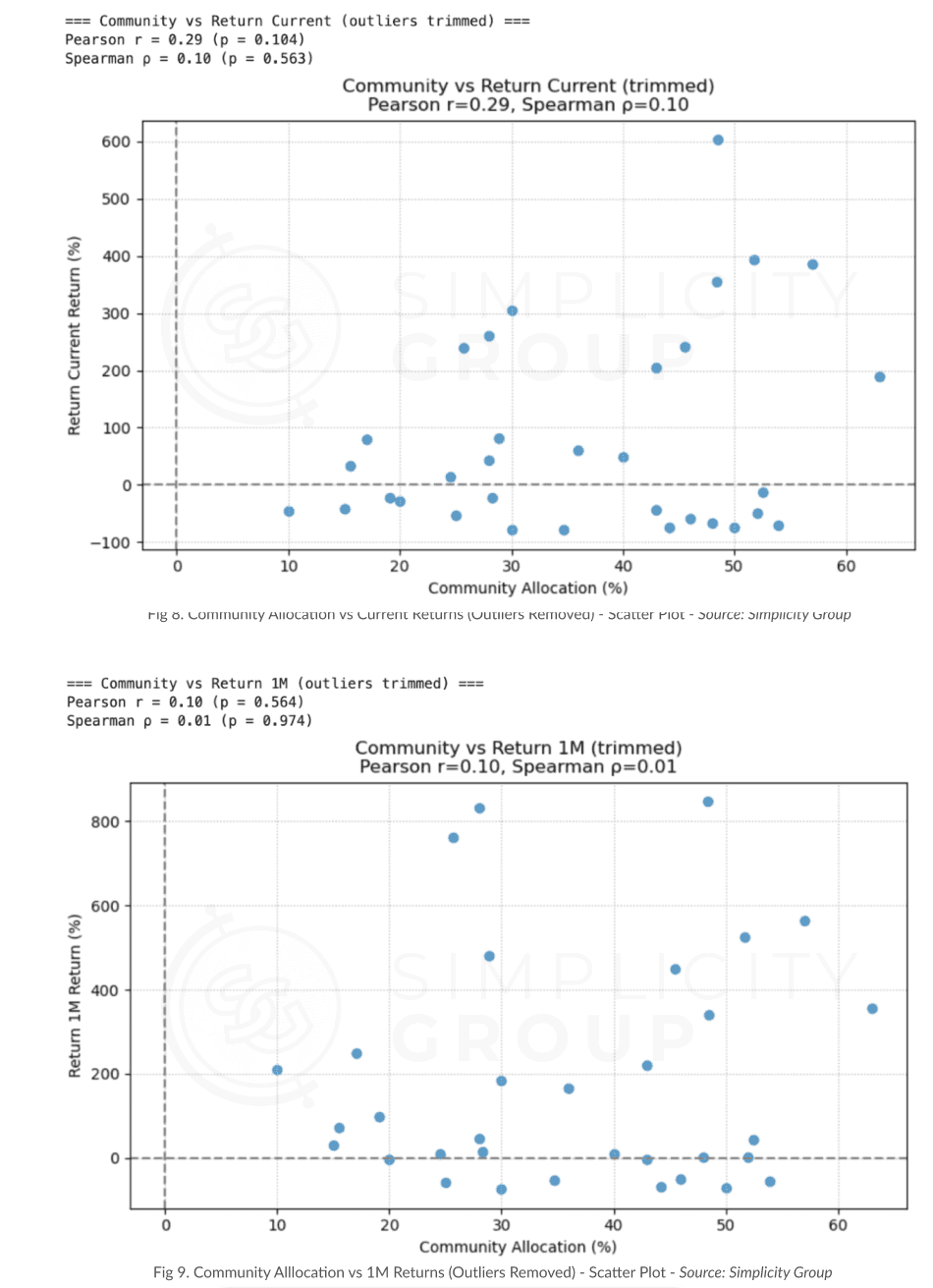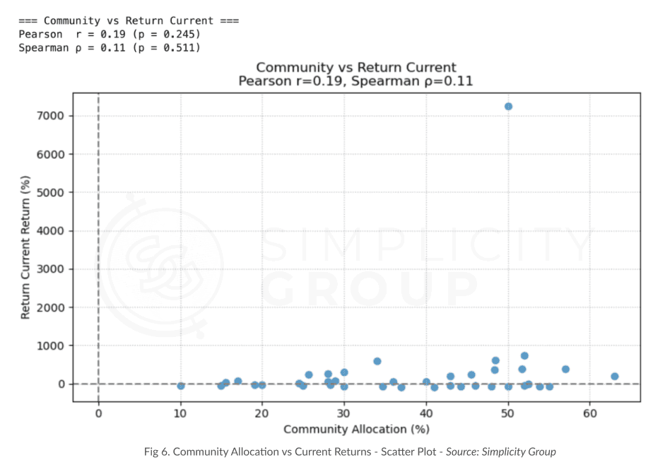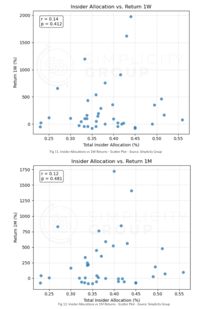 In the scatter plots above, we see how the project’s community allocations are scattered all across the place and there’s no clear upward or downward trend as insider allocation increases. Although the 1-week scatter plot shows a slight positive tilt with an r = 0.14 and p = 0.412, and the 1-month and current ones have similar weak coefficients of 0.12 and 0.06 but p values are extremely above 0.05, meaning that none of these correlations reach statistical significance anyways.
