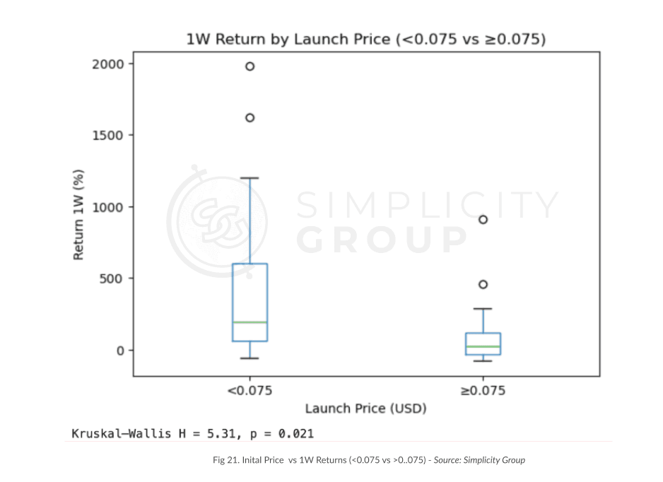 It allowed us to confirm that tokens launching below $0.075 obtained both a higher median gain and a more robust upper tail, meaning that there were more big winners. While it's likely a correlation and not direct causation, such a strong strong significance indicates that it may be a causal relationship.