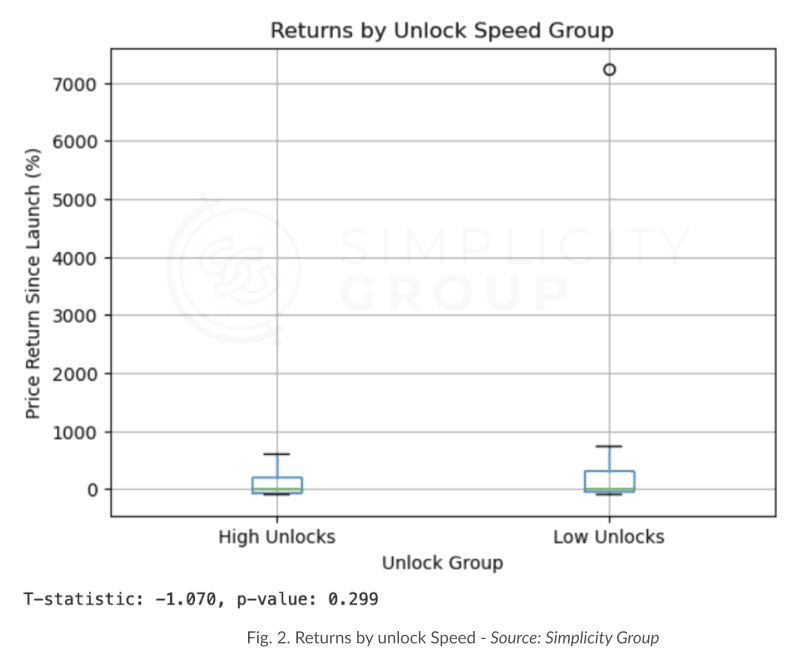For these reasons, we tried a different approach consisting of separating the tokens with low and high unlocks to see if tokens that unlock more tokens (above the median) could systematically underperform.