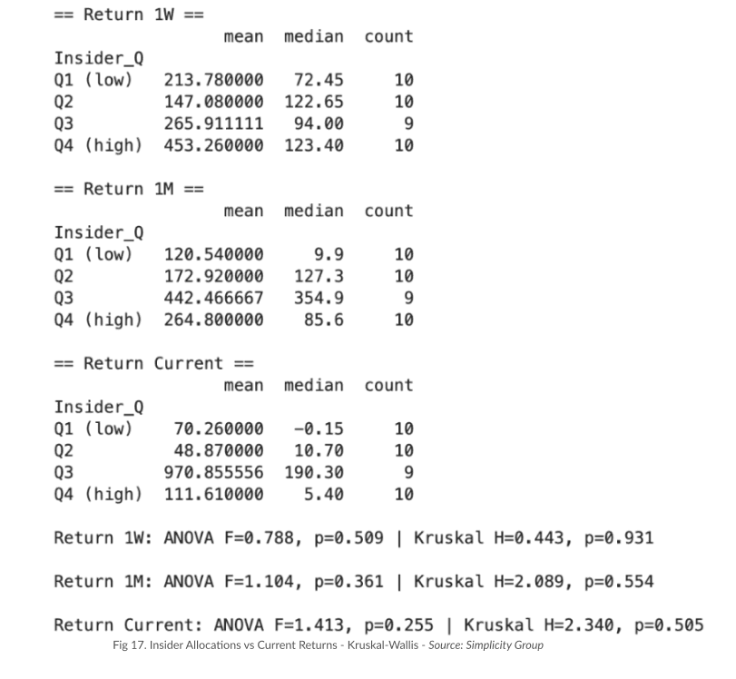 As a last step to rule out our hypothesis, we ran an ANOVA across the four insider allocation quartiles and for each return time frame. In every case, the p‐values were well above 0.05, showing the statistical insignificance. We also ran Kruskal-Wallis tests on the medians, and again, found no significant differences. This final check confirms that returns do not differ systematically across low, mid, or high insider‐allocation groups, effectively disproving our initial hypothesis that insider allocations influence price performance in any way.