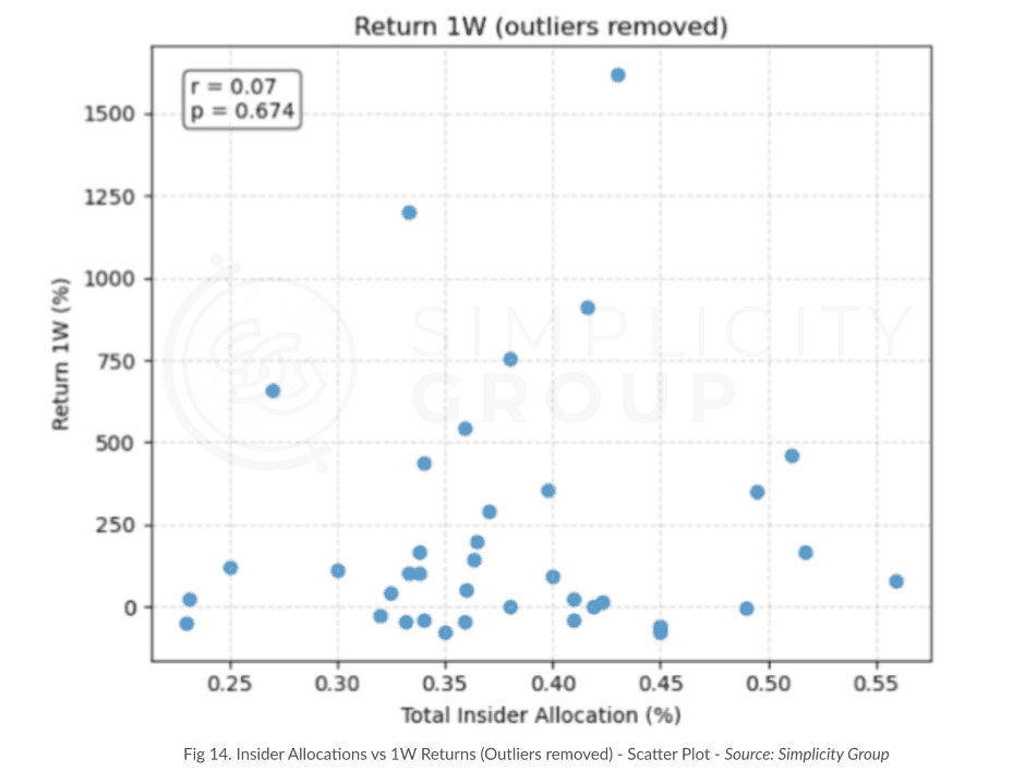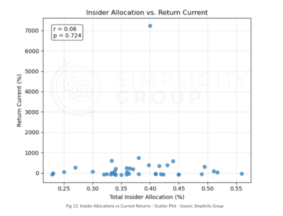 No meaningful correlation was found between insider allocations (team + investors) and price performance, disproving the notion that higher insider shares inherently harm token value.
