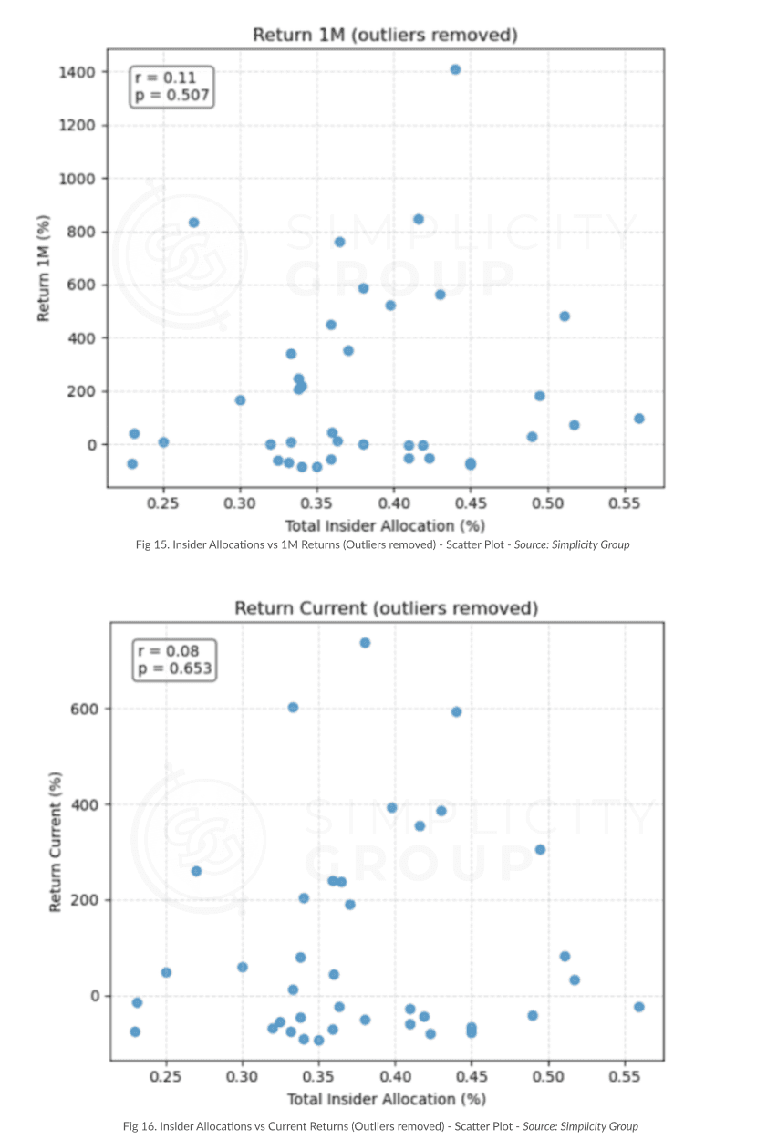 After trimming extreme outliers, all Pearson r’s were close to zero and p‐values well exceeded 0.05, confirming no statistically significant linear relationship between total insider allocation and token returns.