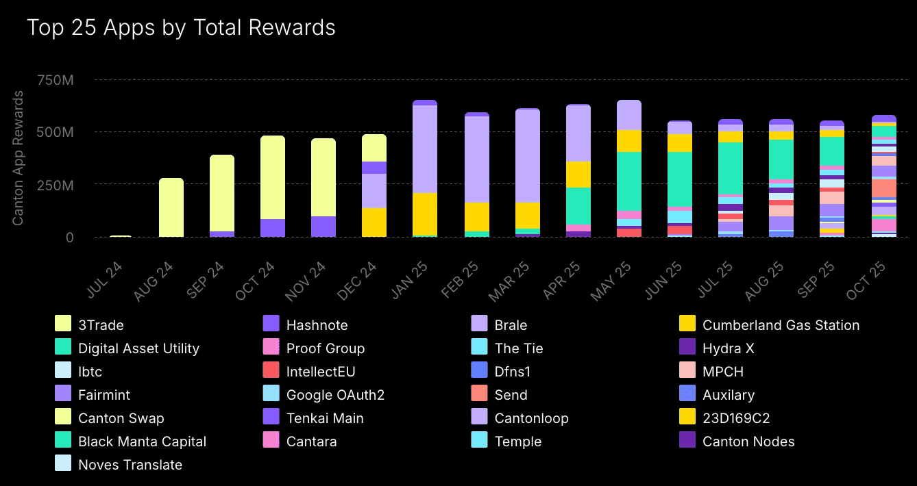 Over time, around January 2025, total rewards climbed up to ~650M with the majority of them being distributed to Brale platform for creating and launching stablecoins on Canton Network. By Q3 2025, Digital Asset Utility is the top app due to providing ecosystem pre-built composable apps, but its share is much smaller. Instead of the early phase where a single app captured most of the rewards, these are now more distributed as the ecosystem matures and daily active users seek diverse utilities.