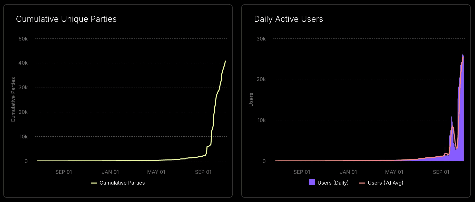 Daily Active Users (DAUs) remained on the lower end for a large period after the network’s launch, and then surged by Q3 2025. Early, shortly after the network launched, it had only a few hundred daily active users. It first crossed 1,000 DAUs in August 2025, reached 10,000 on September 28, pulled back briefly, and hit 20,000 on October 19.