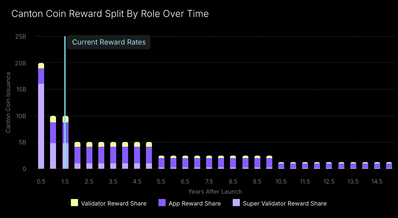 Canton Coins are minted every 10 minutes and are distributed to Super Validators, Validators and Ecosystem Apps as rewards for activity. The network usage fees are completely burned.