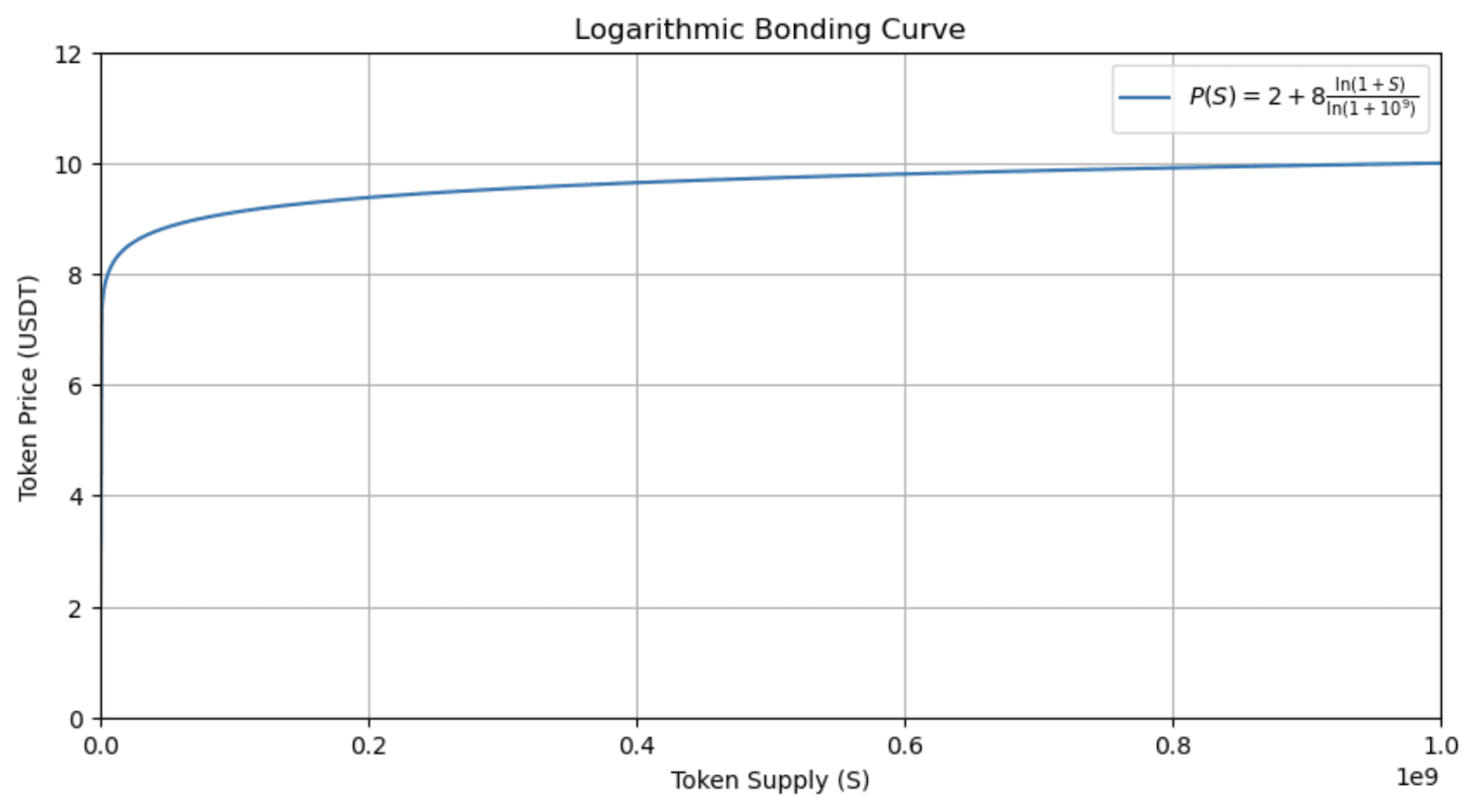 The logarithmic curve gives a low, stable price at early token supply levels, then gradually increases the price as more tokens are issued. Even if the token supply increases considerably, the logarithmic growth ensures that the price change remains gradual, which may help maintain liquidity and predictability.