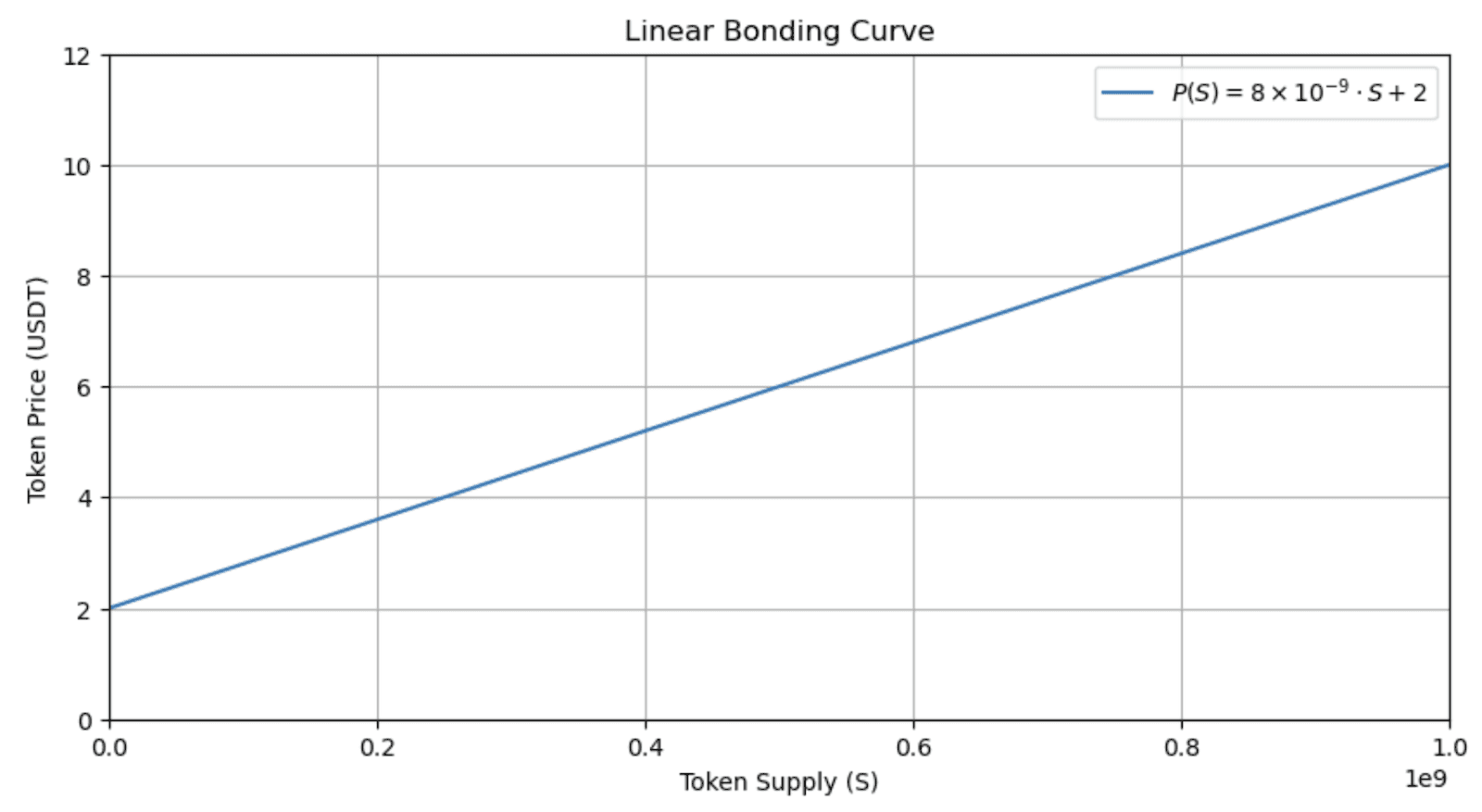 As a first example, let’s assume a project that has a fixed maximum token supply of 1B tokens. The founder is targeting a final price of $10 per token when all tokens are minted, and expects total deposits of around $6B USDT. By using a linear bonding curve, we can find the price function is P(S)=810-9S+2, where “S” is the token supply. This function means that the token starts at a price of $2 and gradually increases to $10 as the supply reaches its cap.