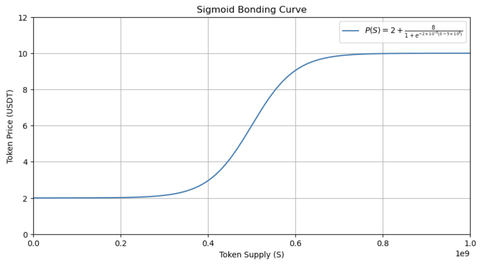 If a project wishes to introduce a mechanism through which early participants are rewarded with the lowest prices and a steeper price increase later on, creating scarcity as the token supply grows, a Sigmoid Bonding Curve would be ideal. This curve is characterized by an S-shaped curve which starts off with low, stable prices to incentivize early adopters, then experiences a sharp increase at inflection point, and finally levels off again to become stable as it approaches a pre-established price cap. This design not only rewards early entry but also provides a predictable pricing model during later stages, balancing incentive with market stability in later stages.
