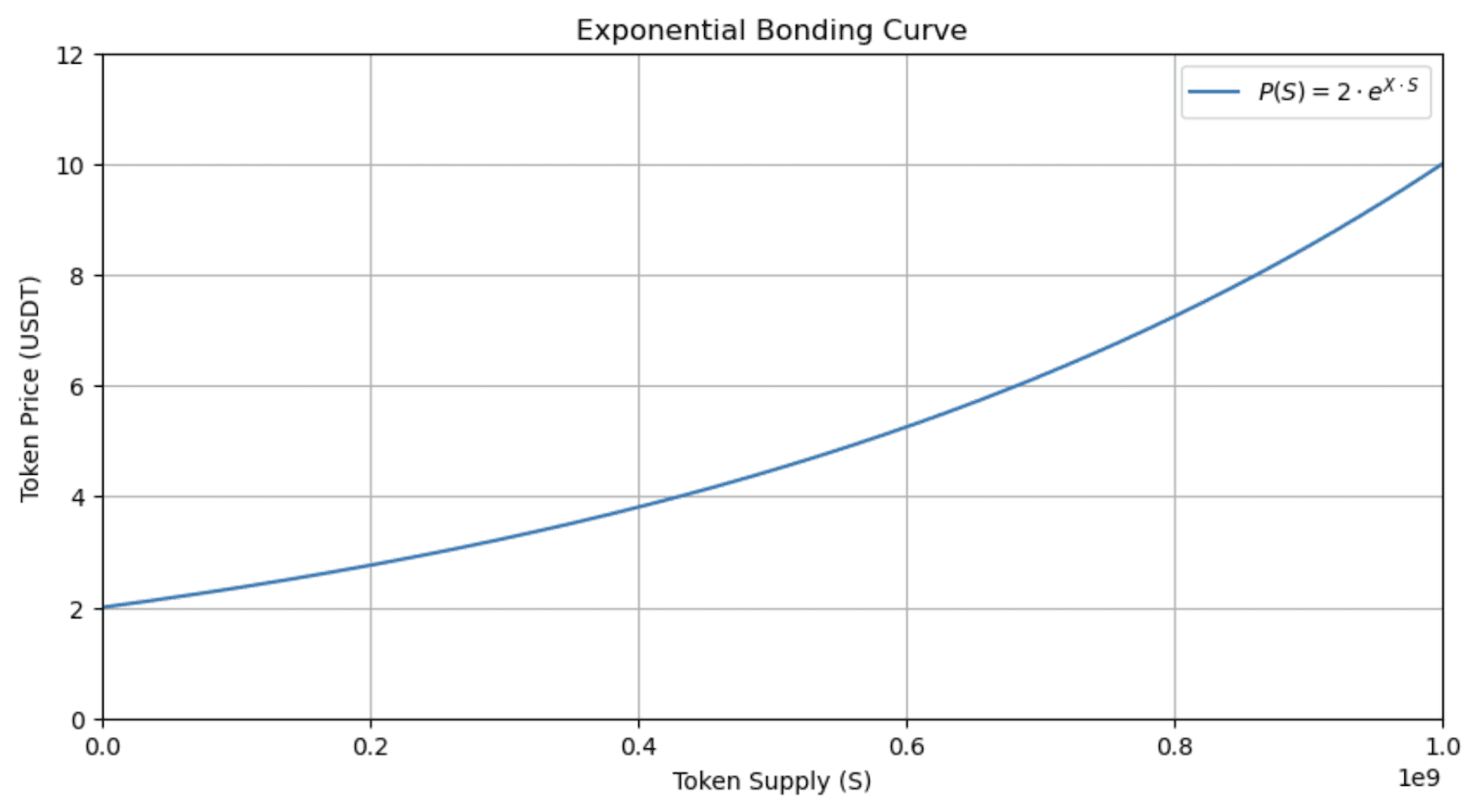 Under this scenario, the price function was defined as P(S)=2e1.60910-9S. The exponential bonding curve where the token price starts at $2 and reaches $10 when the supply hits 1 billion tokens. The slow initial price increase and steep increase as supply grows showcases how the exponential curve introduces scarcity, making early tokens significantly cheaper than those later in the minting process.