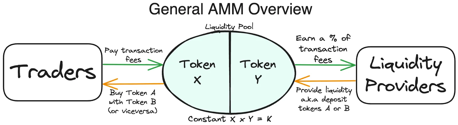 AMMs are then born as a mechanism where users are able to deposit tokens in a pool to provide liquidity. Pools are smart contracts that hold different tokens to facilitate transactions in DeFi and they calculate the tokens’ prices based on the ratio of assets in that pool. Traditionally, AMMs use a constant product formula that ensures that the product of the quantities of two assets in a liquidity pool remains constant. The formula is xy = k, where x = the amount of token A in the pool and y = amount of token B in the pool.