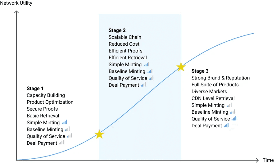 This first stage consisted of building Filecoin during initial phases. When sufficient storage was provided, both providers and clients had engaged with the protocol enough and thus, the economic incentives shifted toward rewarding the most efficient operators