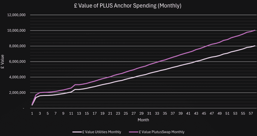 Cumulatively, a lot of tokens circulate through the utilities. In total, as per the model, Plutus would need to create around £570M worth of value over the course of 5 years. This is obviously a substantial sum, but fundamentally, if Plutus doesn’t have this much cumulative value within its utilities then users will simply redeem their PLUS on a first-come-first-served basis, and when utilities run out then users will simply hold onto their PLUS due to the expensive withdrawal fee.