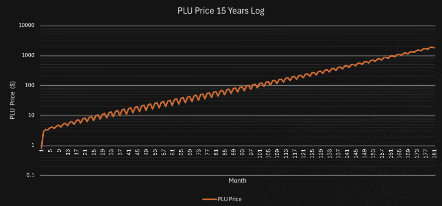 The price of PLU grows at an exponential rate into the thousands of dollars, which is better visualised on the logarithmic scale.