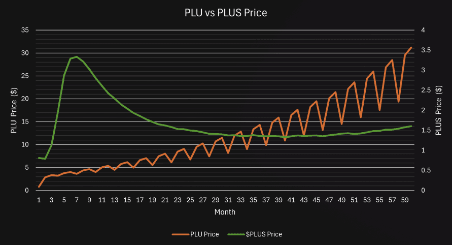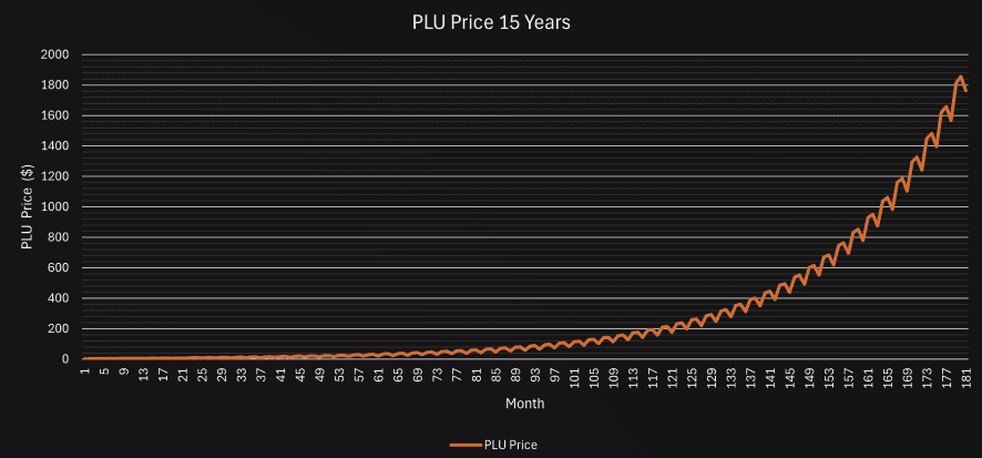 We see the PLU price steadily grow with the buy and sell shocks happening every 3 months (at different months) creating this staircase pattern. After 5 years, assuming current inputs remain accurate within a reasonable degree, the price of PLU grows towards $30.