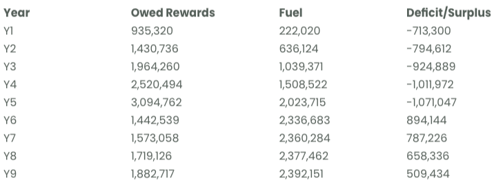 Looking at the FUEL, it is evident that at 5%, by year 6, there is sufficient FUEL to cover CRY rewards at their maximum and the Perks + Emissions (cashback) rewards, without even factoring in any forfeits (albeit they are factored in indirectly within the Machinations model).