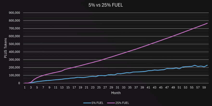 We have played around with the model to see whether increasing the FUEL tax from 5% will increase the quantity of PLUS tokens collected as FUEL to a relatively significant amount, and found that even 5x more FUEL tax (25%) doesn’t increase the quantity of FUEL collected in the first few years by a significant amount. Moreover, this will severely damage the user experience. Hence, we strongly advise avoiding it.