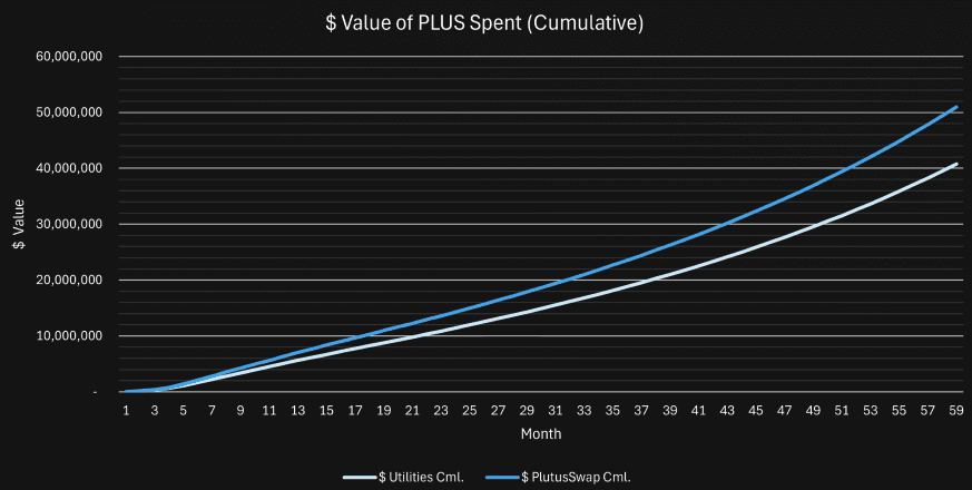 For the team to understand how much PLUS users actually end up spending, and how much $ value the team is required to create with its Utilities and PlutusSwap features so that users can spend as much PLUS as the model expects, as a function of PLUS price and quantity, we have modelled out the numbers.