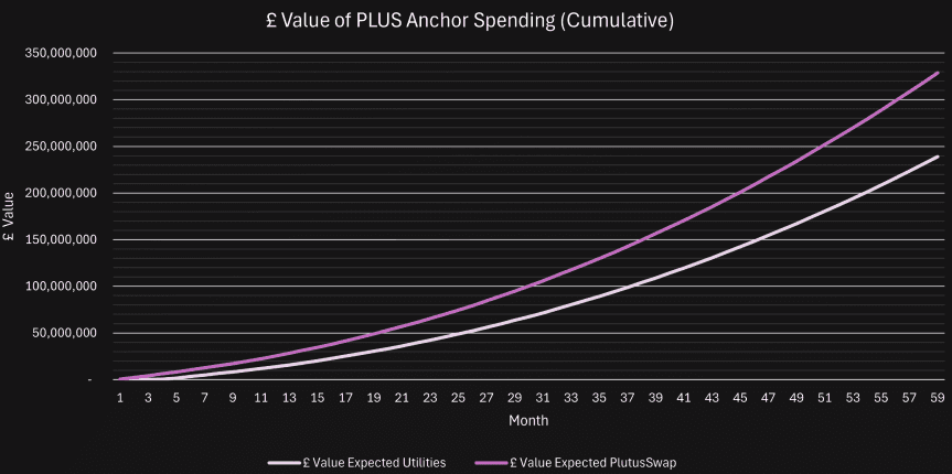 This is obviously far lower, cumulatively at ~$92M, than the £570M with the anchor. Thus, we recommend Plutus to greatly reconsider their £10 anchor to something more reasonable, like a £3-£5 anchor, or even simply scrapping the anchor altogether and just selling the utilities products for their value in PLUS value.