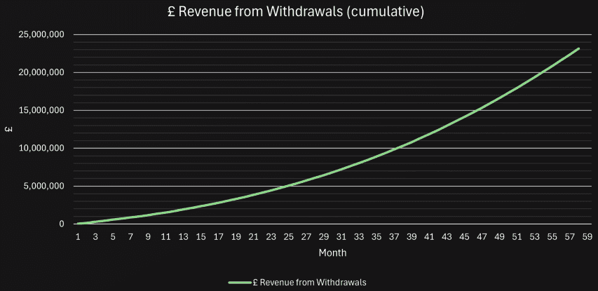 As per the model, Plutus stands to make just under £23M in total over the course of 5 years by taxing users at a £10 anchor for withdrawing PLUS directly onto exchanges.