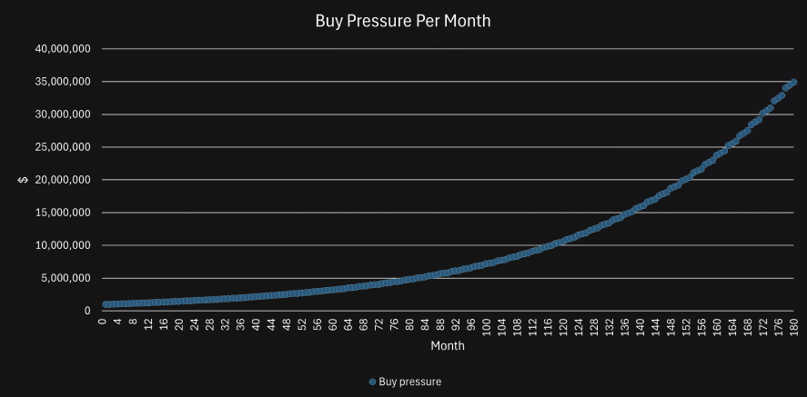 This is the result of the Buy Pressure growing year on year. By year 15, we see in the model it reaches $35M per month (obviously improbable but this is the result of growing rate of buy pressure MoM). If we take Plutus’ current number of users - 168,667 - to account for $1.2M in buy pressure, this means to reach $35M Plutus needs 4,919,454 users, ceteris paribus.
