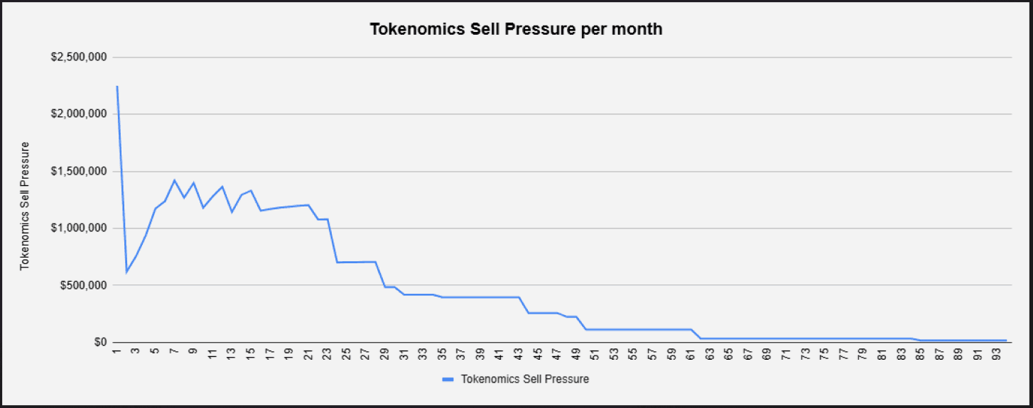 Without modelling recursive buy/sell pressures, we have a super high-level expectation of sell pressure, done by calculating new tokens and multiplying by launch price, indicated below.
