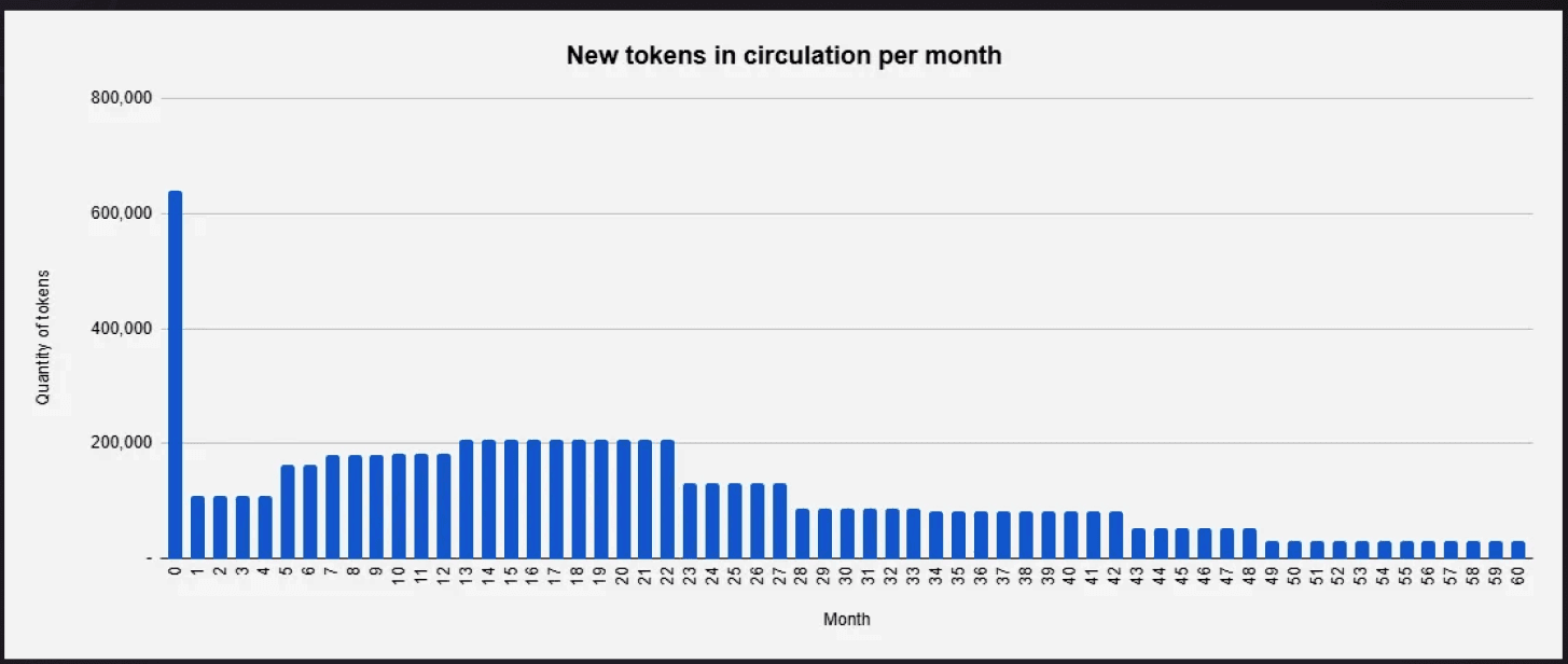 Looking at the unlocks on a month by month basis, we can see the tokens gradually coming into circulation faster up until the end of the 2nd year where they slow down significantly.