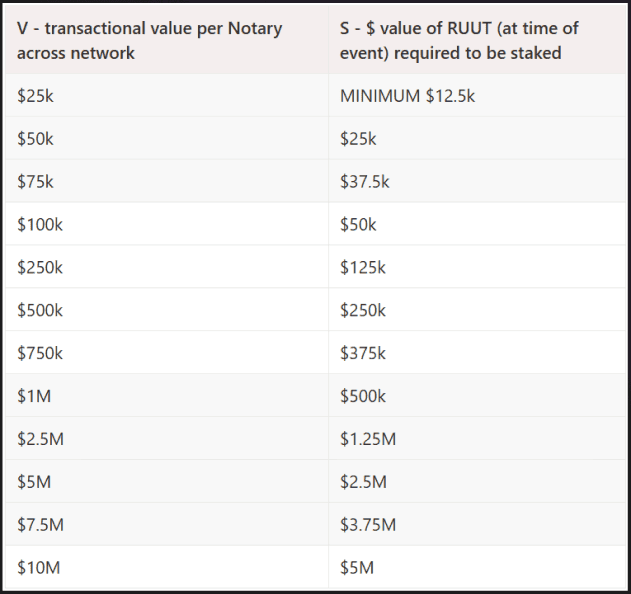 Note: if V is below $25k, the Notary would still need to stake $12.5k worth of RUUT.
