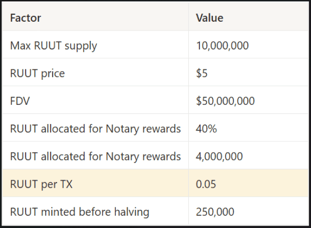 Notaries earn RUUT for Notarising, with details outlined in the economy section and in the designed calculator. It undergoes disinflation (like Bitcoin) when minted for Notaries.