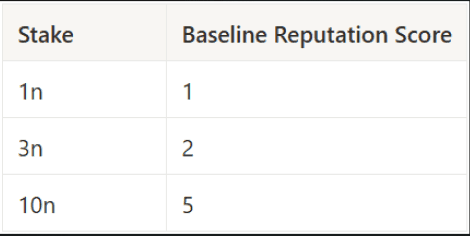 The reputation score of the Notary will go down in line with their slashing penalty, explained below in the bullet points that showcase what happens to an Notary’s stake when one reaches a conclusion the others did not. If their stake gets slashed by 10%, this factor of the reputation score drops to 0.9.