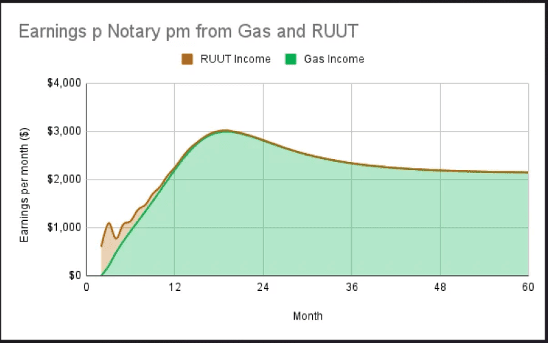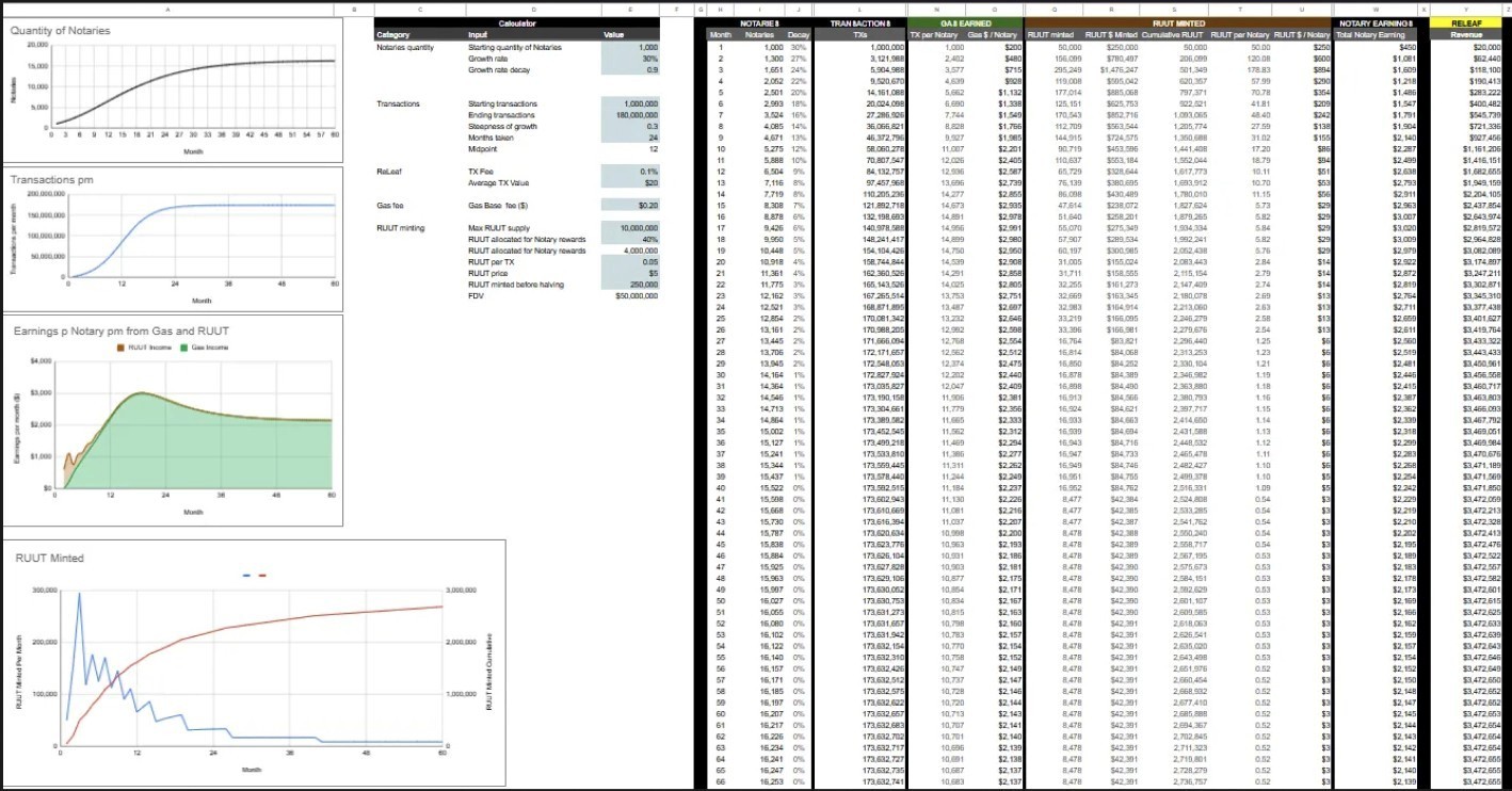 This produces the chart above which visualises the earnings per Notary are supplemented to at least $1k per month. Between months 12-30 there is a spike up to $3k due to the growth of Notaries being slower than the S-curve growth of transactions, but otherwise, the RUUT in the first year does a good job of supplementing the rewards to the minimum ReLeaf wants to sustain.