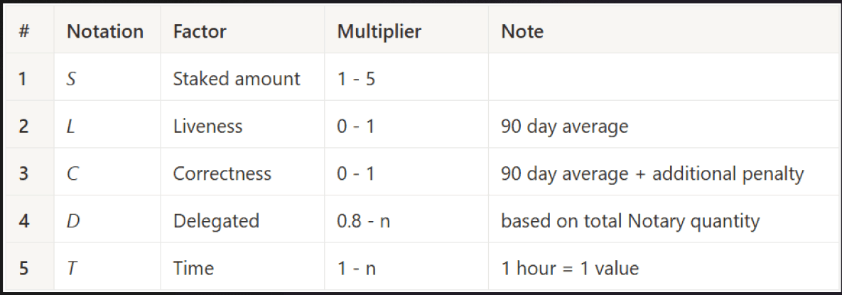 The scores for each factor get multiplied together to reach a final score, which then gets multiplied by 100 to get an integer. These integers represent “ballots” in a pool which randomly selects Notaries to Validate: higher rep score = more ballots = more chance of selection.
