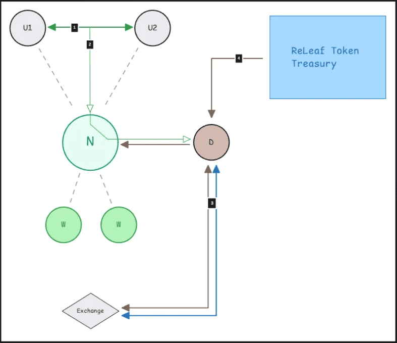 User deposits fiat or cryptos onto ReLeaf, and ReLeaf mints the user LEAFs at a 1:1 value. This fiat/crypto is stored in the ReLeaf treasury. Crypto is likely to be sold for stablecoins instantly to avoid Forex risk.