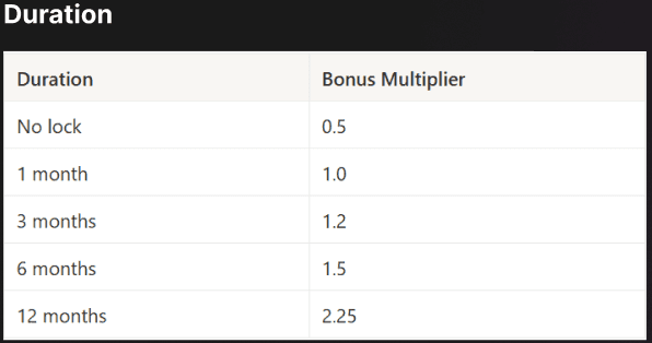 Locking tokens for longer durations increase the share of their rewards in relation to their peer delegators. The lock, and corresponding bonus is outlined below, and is applied via the following formula: